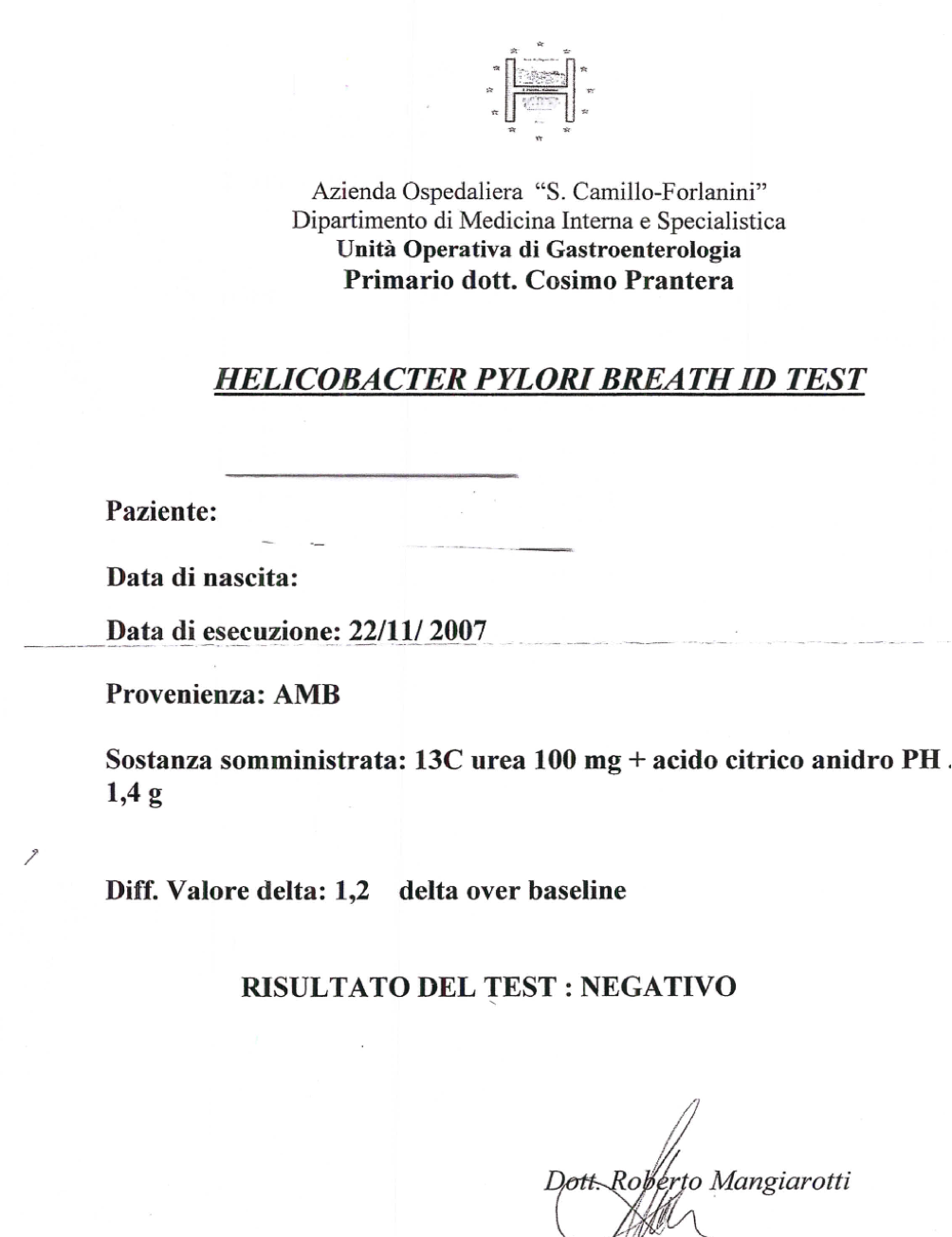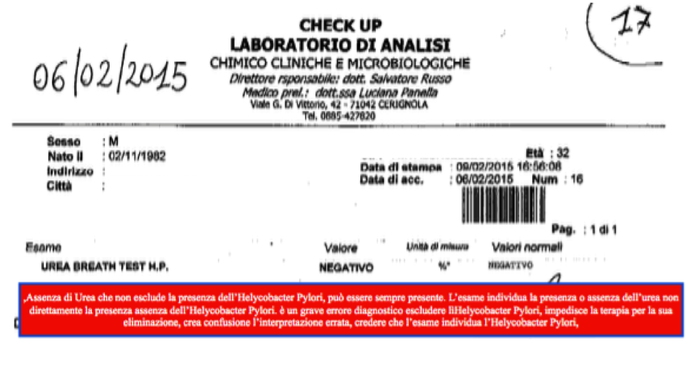Western Blot positivo Helycobacter Pylori altamente patogeno, il Breath Test negativo, la diagnosi è falsata dal Breath test, la persona non esegue terapia per Helycobacter Pylori e rischia patologie importanti dell’apparato digerente, i sintomi proseguono, la persona è in grande confusione per l’affidamento su un esame inattendibile.
