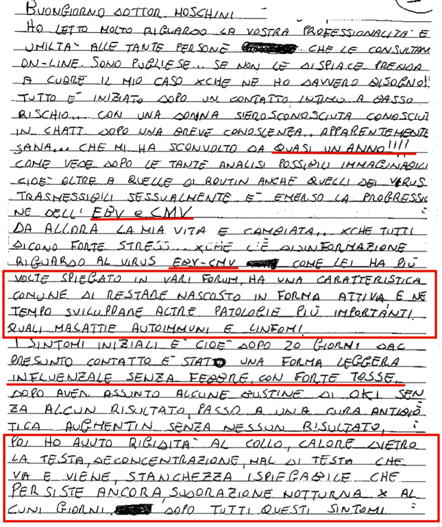 Egregio, è fondamentale eliminare il virus di Epstein Barr e Cytomegalovirus, con la certezza della loro effettiva radicazione. Gli esami che ha indicato dimostrano con certezza la presenza del virus di Epstein Barr e Cytomegalovirus. Non comprendo come mai alcun medico ha mai tenuto in considerazione la presenza del virus di Epstein Barr e Cytomegalovirus, quando sono anamnestici, e precisi del ragionamento clinico.