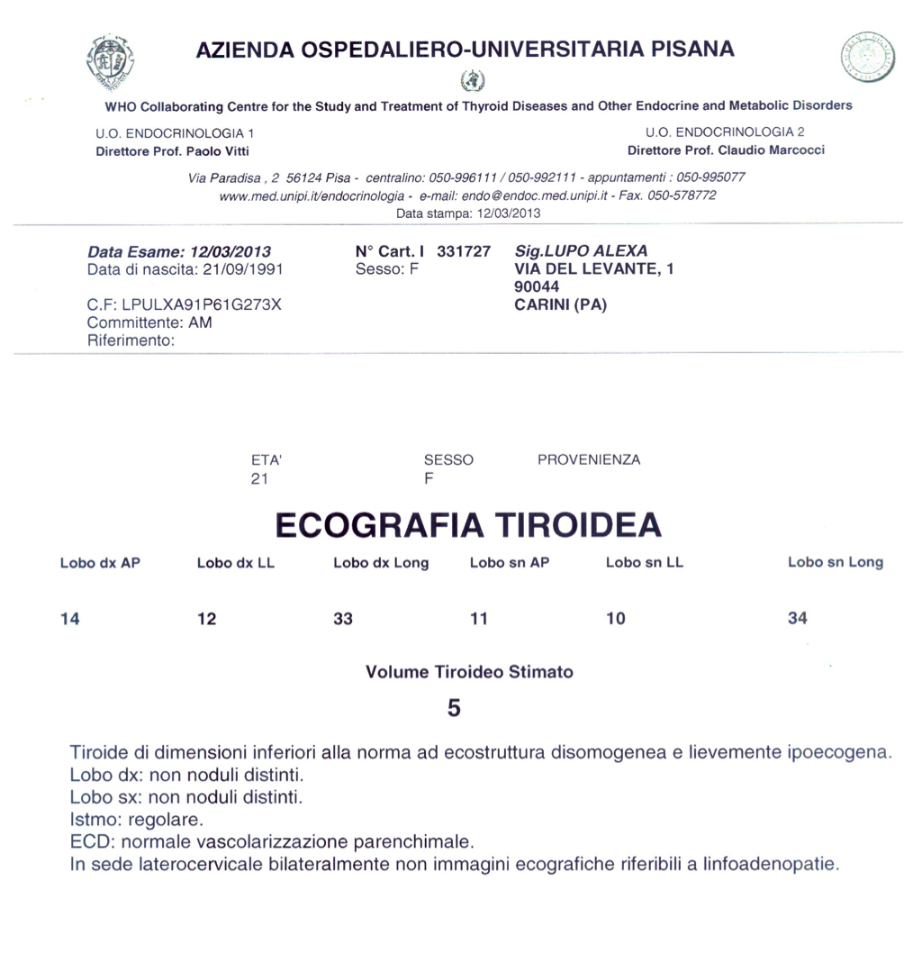 Dal 12 03 2013 lei ha una tiroidite, come evidenziato nella ecografia, Tiroide di dimensioni