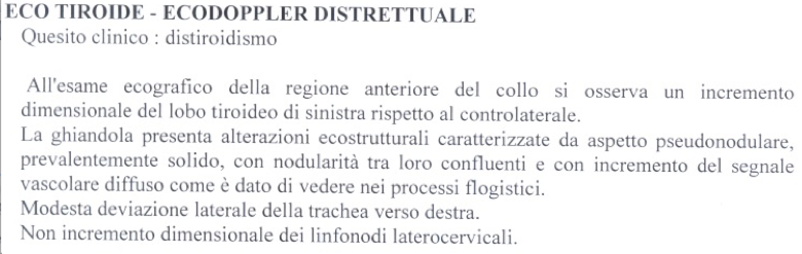 Egregia, "regione anteriore del collo si osserva un incremento dimensionale del lobo tiroideo di sinistra rispetto al controlaterale. aspetto pseudonodulare, nodularità tra loro confluenti, incremento del segnale vascolare diffuso", il radilogo segnala la presenza di processi infiammatori.