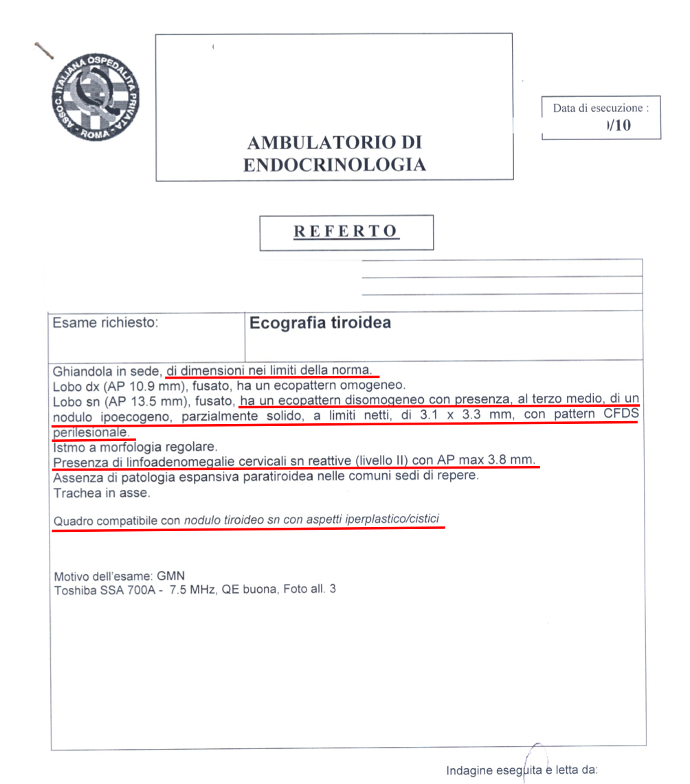 “Nel 2010 ultimo controllo tiroide (mi madre ha avuto un carcinoma):rilevato con ecografia un nodulo ipoecogeno con pattern cfds perilesionle e presenza di linfoadenomegalie cervicali sn reattive . mi hanno detto di non preoccuparmi, non ho mai approfondito.”