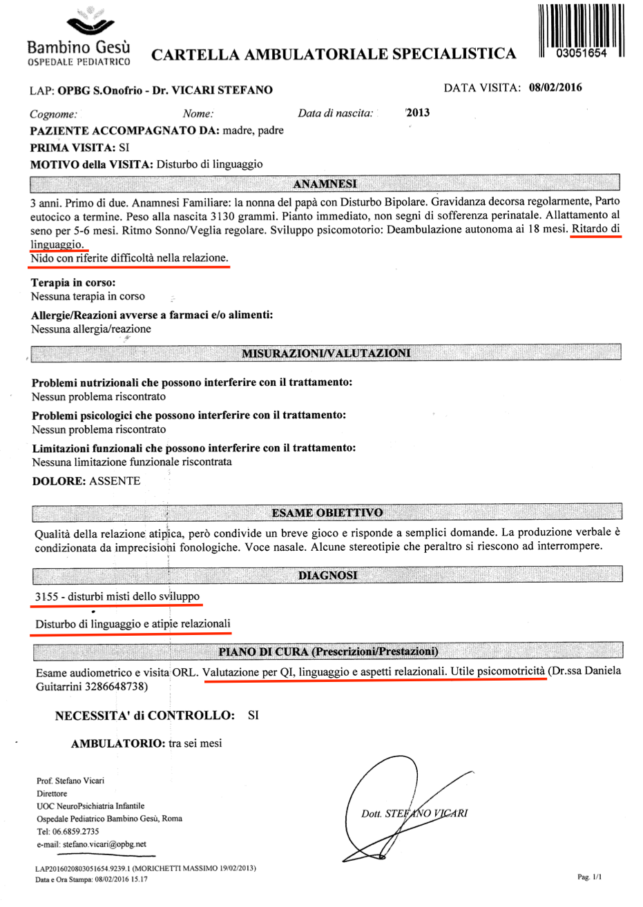 Le indico gli esami che ha eseguito e come viene seguito con terapie comportamentali, ABAS, di cui non vedo benefici, anzi ogni volta che il bambino si ammala o ha la febbre, peggiora costantemente.